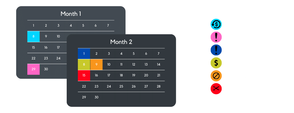 Below is an example of what a payment schedule would look like for a client that purchased a package on the 8th of the month on a monthly billing cycle.